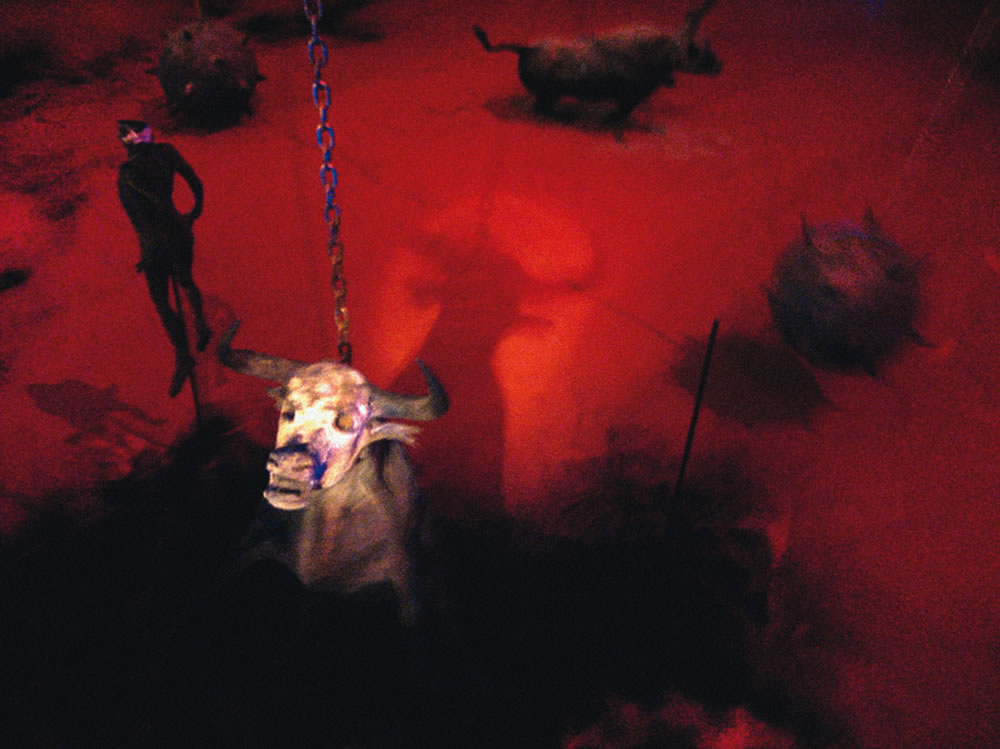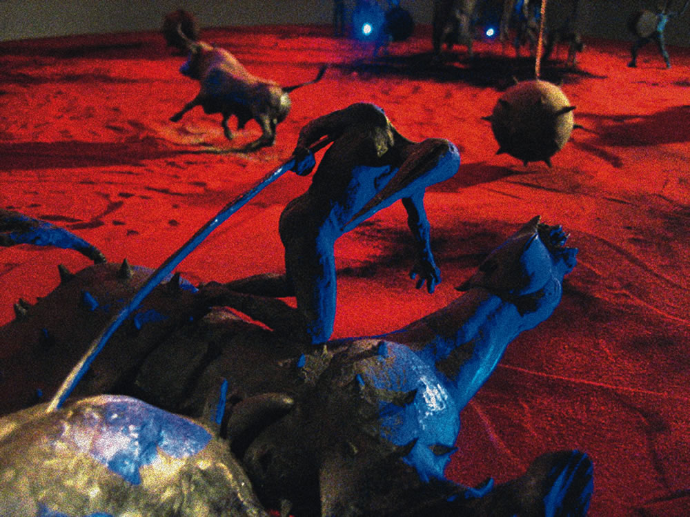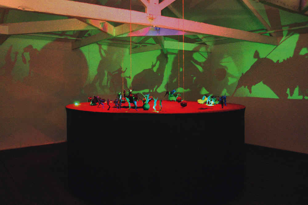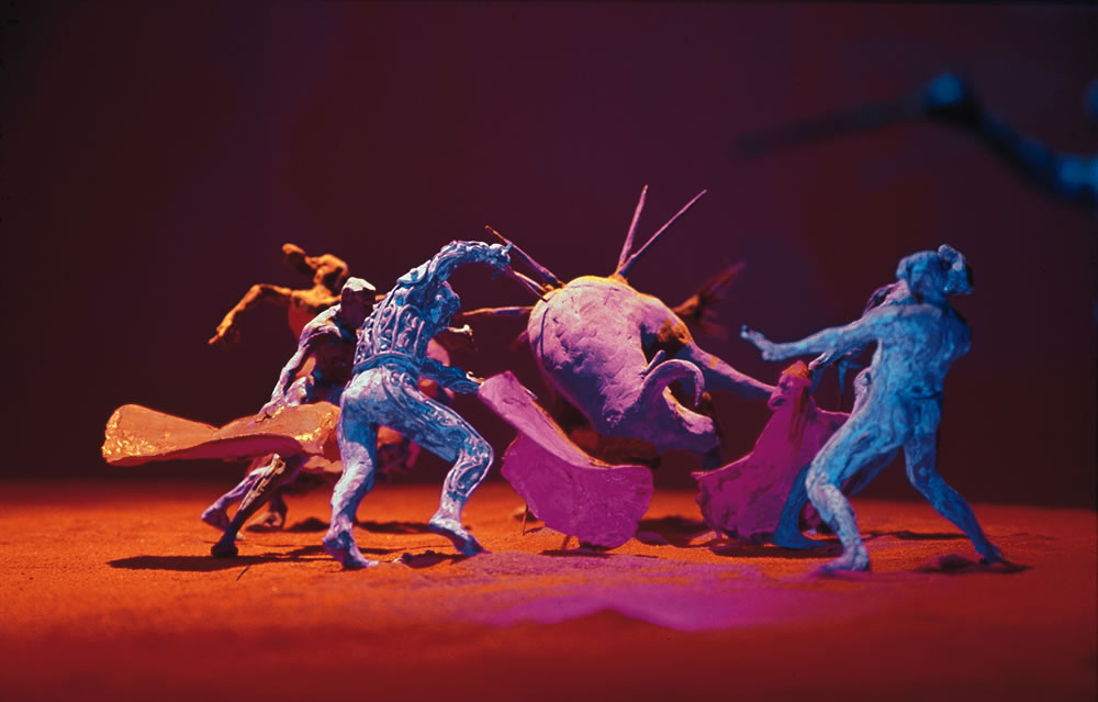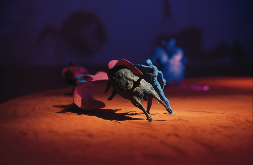 The installation depicts a world that rages with an explosive knife-edge energy, passion and grace. Elements of beauty, sensuality and brutality are merged together. Bulls charge across the arena, figures dance, turn and gesture as if driven by an ever- present awareness of mortality. Small wax and resin toreadors, dancers, bulls and horses are placed upon a three-metre wide drum shaped table, which is covered with a thin layer of red pigment. The figures are illuminated by ultra- violet and fibre-optic lighting, which cast shadows onto the surrounding walls. Images repeatedly appear and fade into darkness to the sound of flamenco, merged with voices edited from a radio.