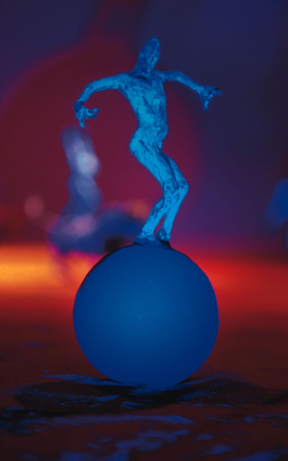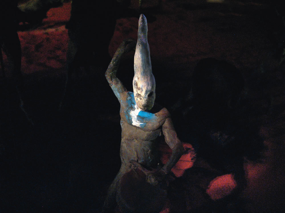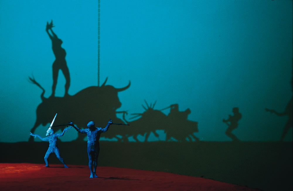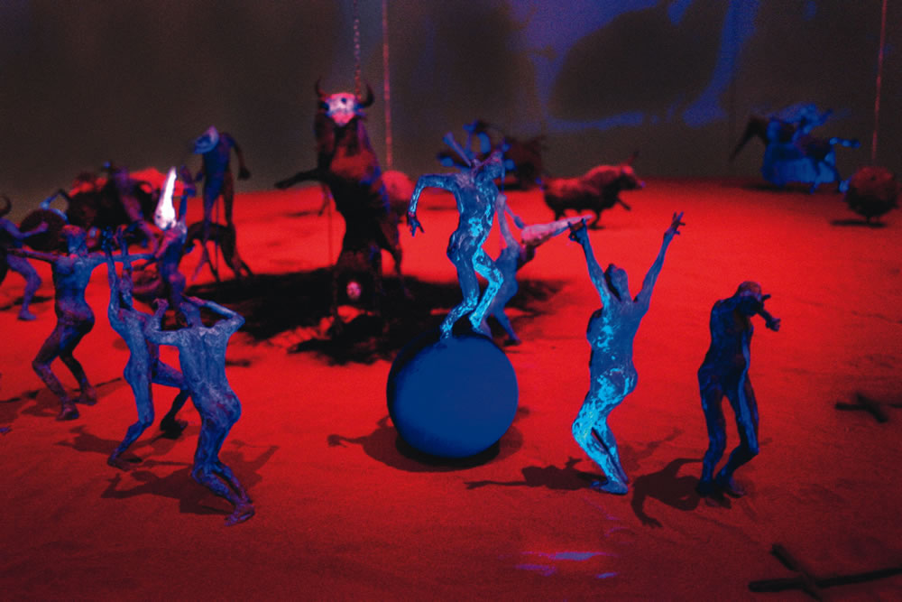 The installation depicts a world that rages with an explosive knife-edge energy, passion and grace. Elements of beauty, sensuality and brutality are merged together. Bulls charge across the arena, figures dance, turn and gesture as if driven by an ever- present awareness of mortality. Small wax and resin toreadors, dancers, bulls and horses are placed upon a three-metre wide drum shaped table, which is covered with a thin layer of red pigment. The figures are illuminated by ultra- violet and fibre-optic lighting, which cast shadows onto the surrounding walls. Images repeatedly appear and fade into darkness to the sound of flamenco, merged with voices edited from a radio.