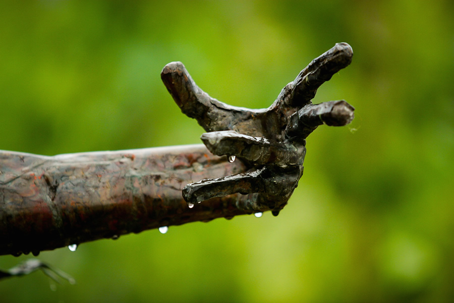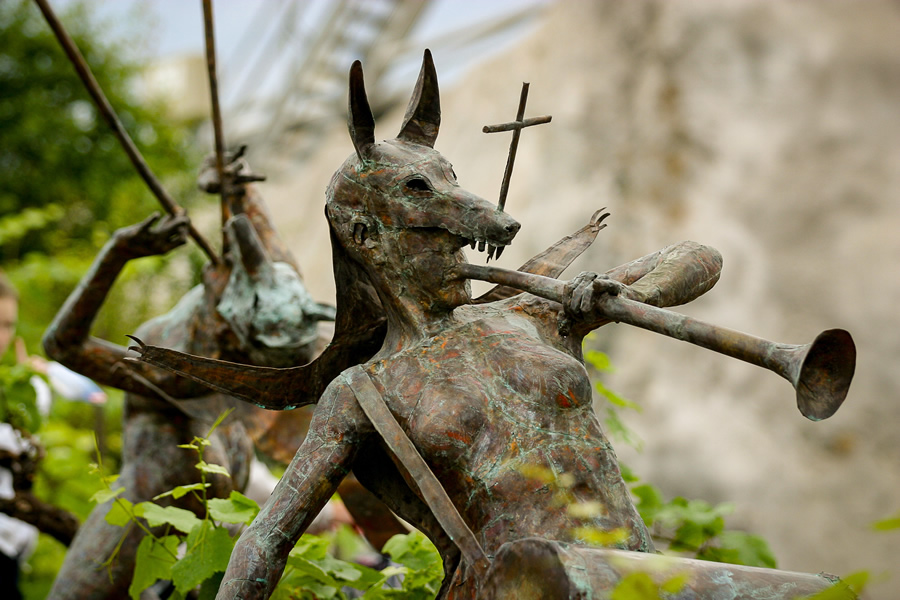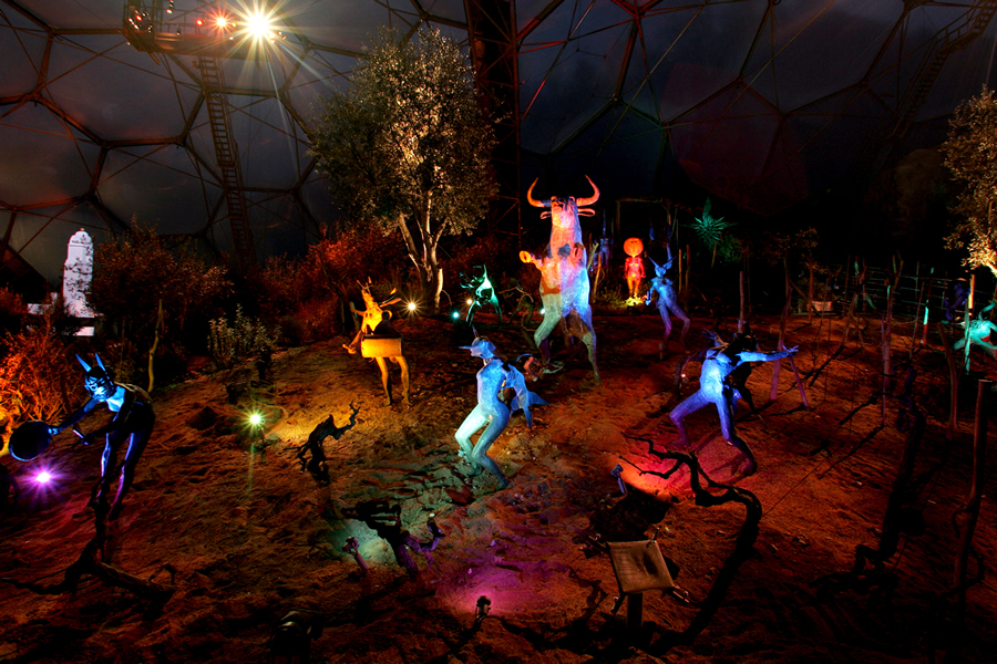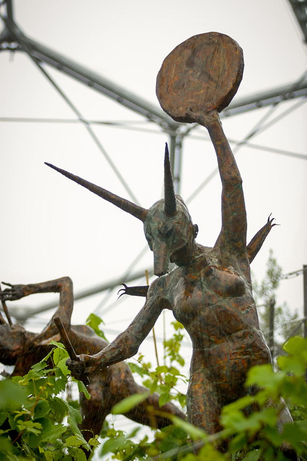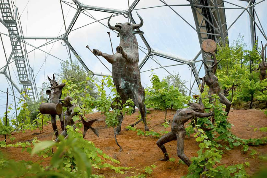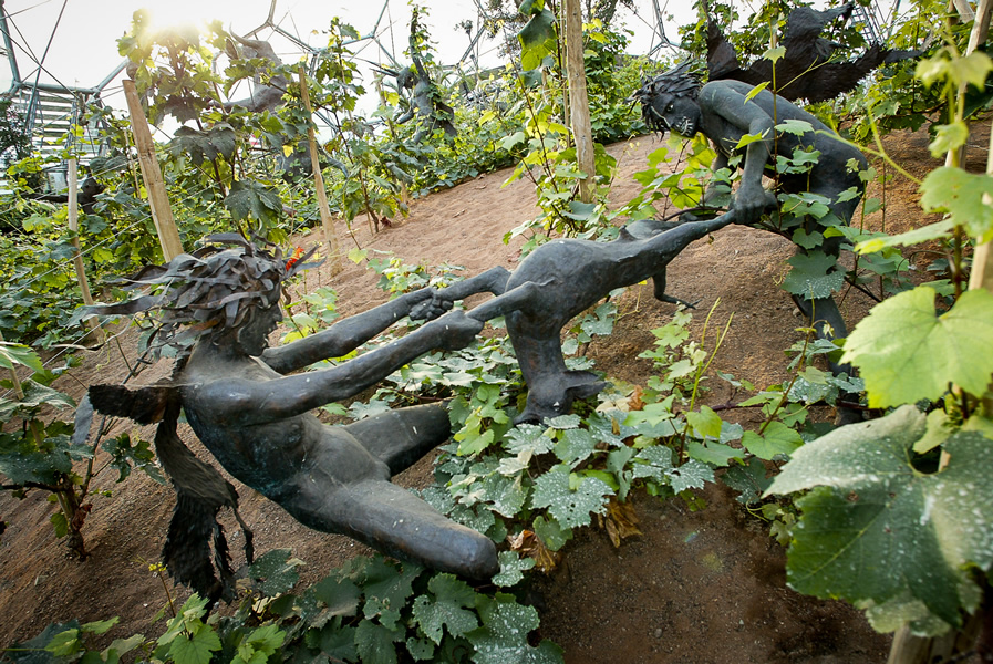 Commissioned by the Eden project, The Rites of Dionysus depicts fourteen life-size copper-beaten figures. Dionysus, the Greek god of the vines presides over the writhing forms of his followers – the Maenads. Interspersed amongst the figures are eighteen copper-beaten vine forms onto which grapevines grow.